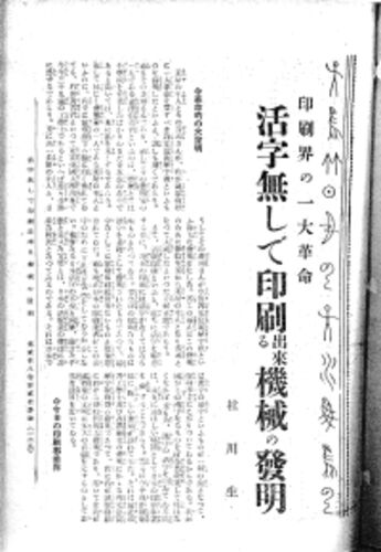 昨日のエントリで紹介した『写真植字機五十年』の中にこんな記述がある。 また〈実業之日本〉は、同年*1十二月一日発行の歳末特大号に「杜川生」というペンネームで「印刷界の大革命*2、活字無しで印刷出来る機械の発明」と題して、やはり六ページにわたって…