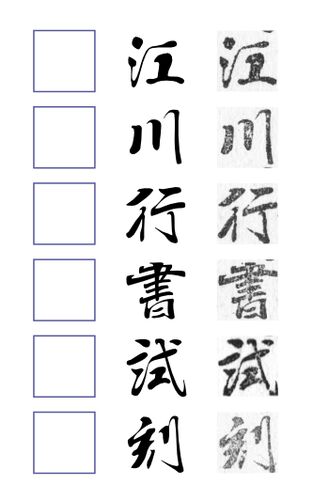 昨日のつづき。「行」「書」「試」「刻」も作ってみた。下の図は字間四分アキ。おー。文字を並べてみると結構それっぽい。でもスキャン画像と比較すると自分の粗も目立つ。「横画が細くて縦画が太い」というのは楷書体・行書体・明朝体などの基本中の基本だ…